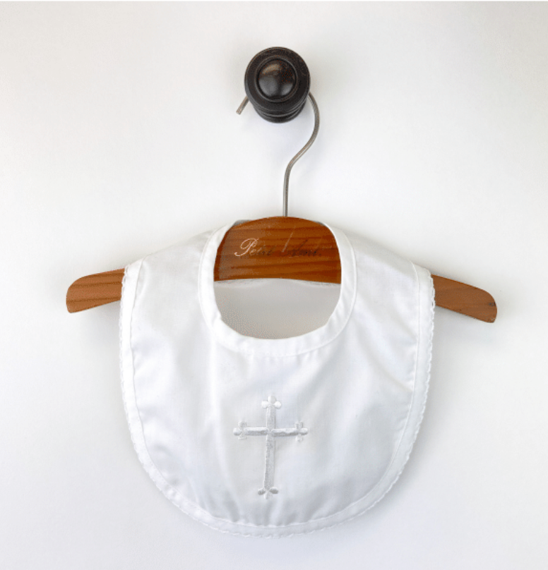 Classic white baby bib featuring delicate embroidered cross detail. A timeless accessory perfect for baptisms, christenings, and meaningful keepsakes. Questions or need help placing your order? Give us a call at (225) 677-7776 — we’re here for you