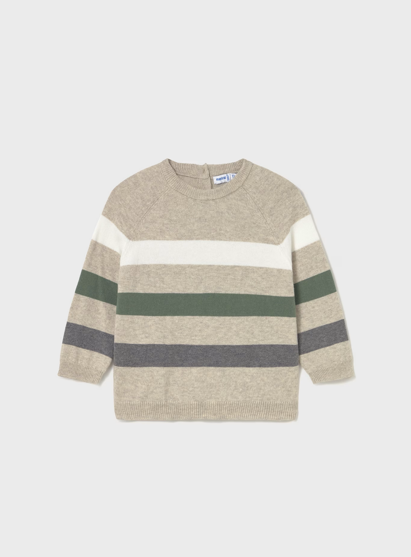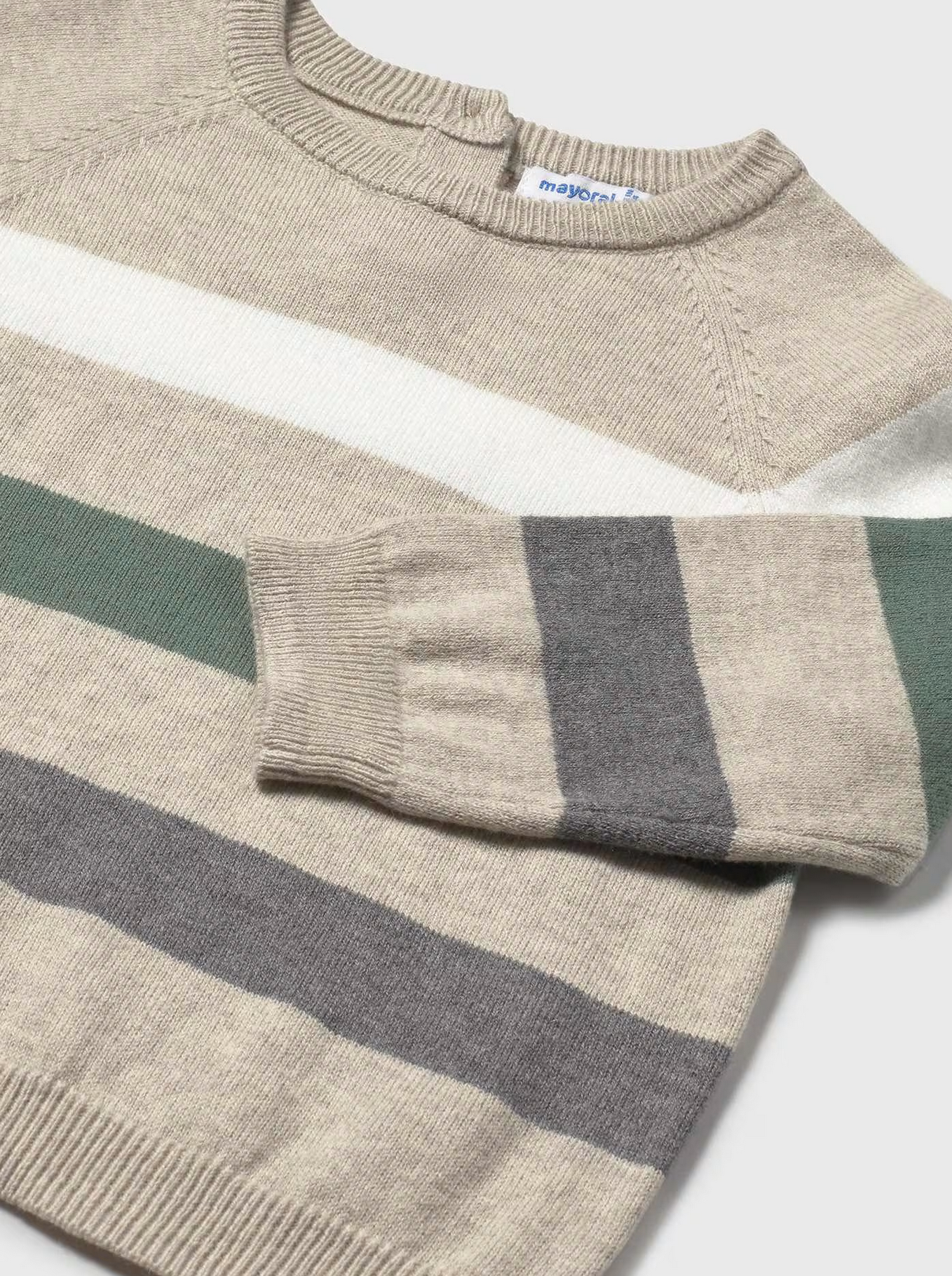 2342/563 Earthy meets playful! Olive green pants pair with a striped sweater in warm tones. A comfy, casual combo for crisp mornings and colorful adventures.