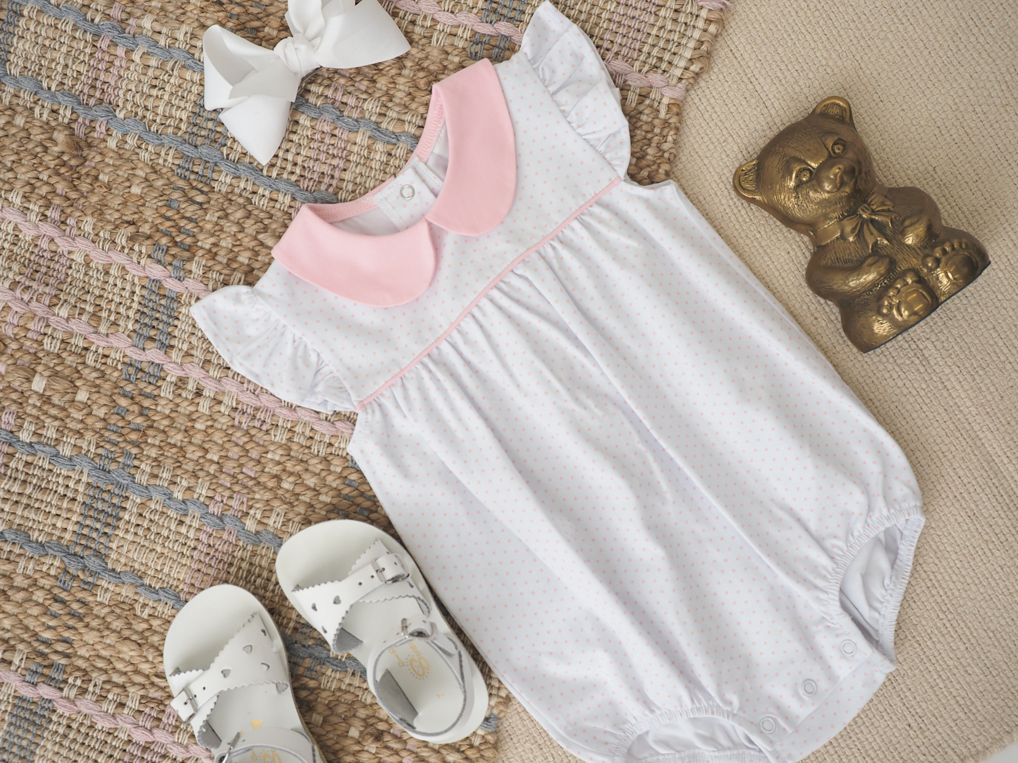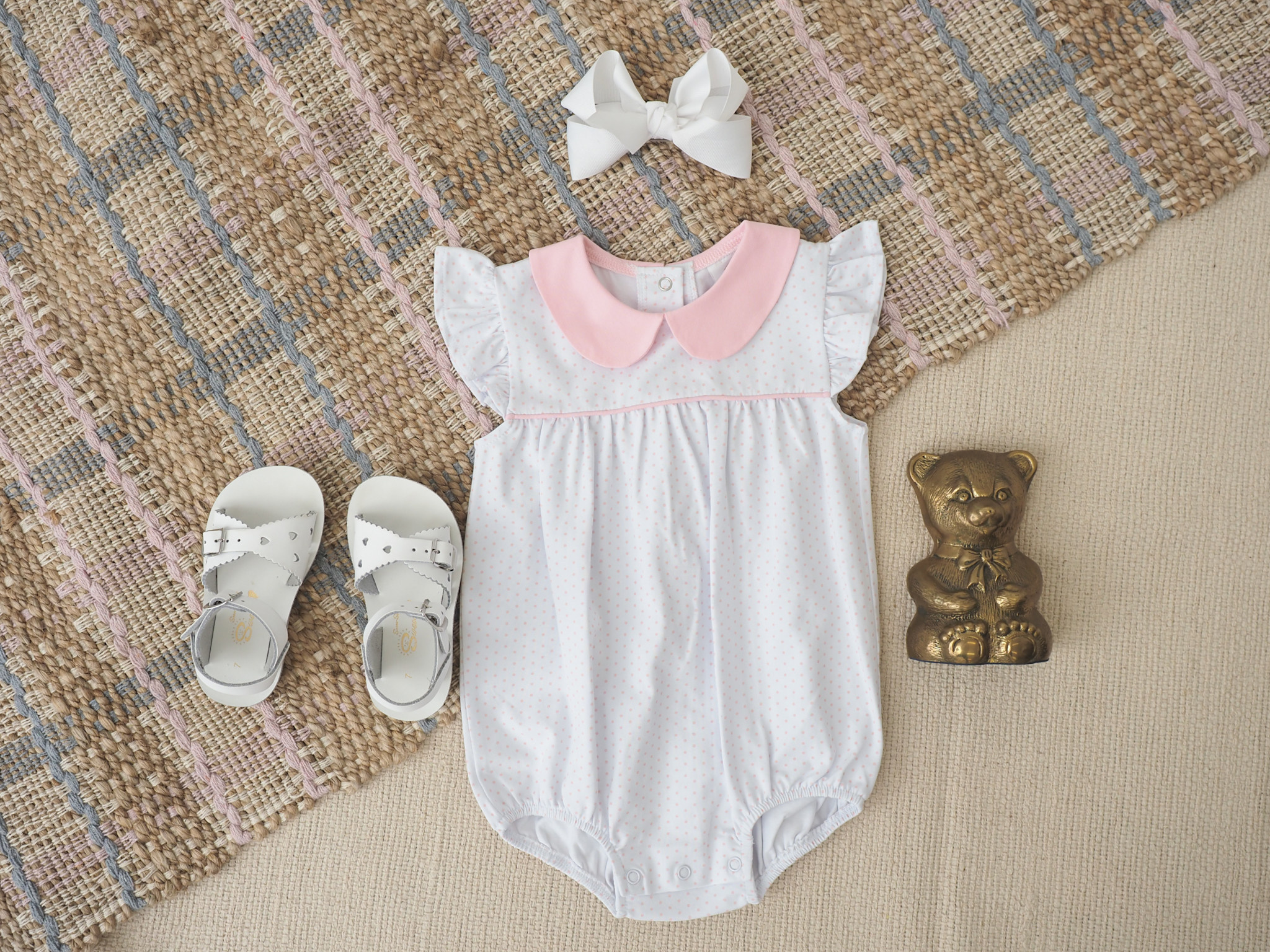 Classic white baby bubble with soft pink Peter Pan collar and flutter sleeves. Sweet, timeless style perfect for portraits, church, birthdays, and special occasions. Need help with your order? Call us at (225) 677-7776