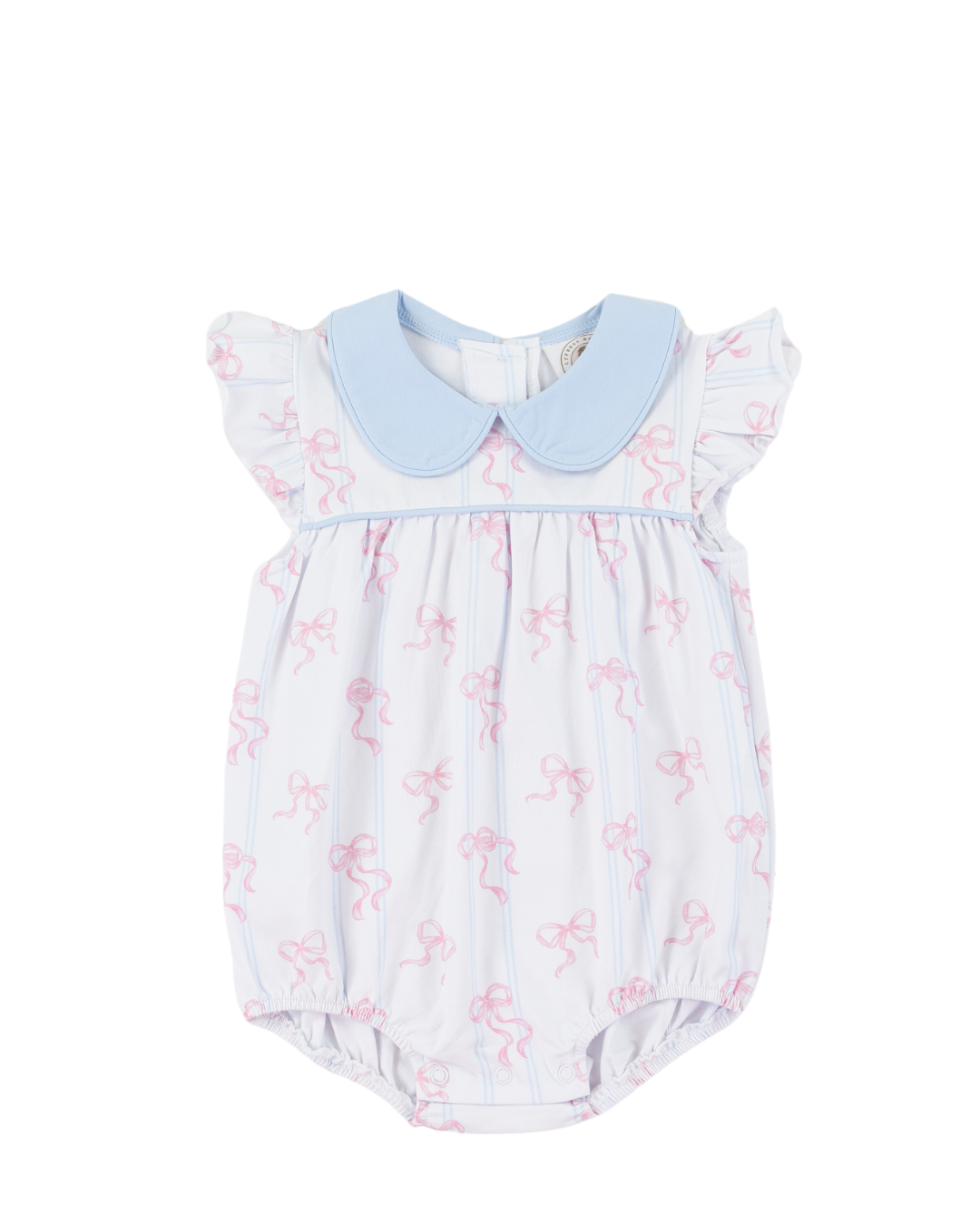 Bowtiful Penelope Prep Bubble features dainty pink bows, a soft blue Peter Pan collar, and flutter sleeves—perfect for portraits, playdates, and polished everyday style. Need help? Call (225)677-7776.