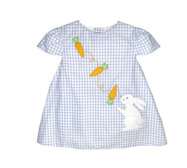 2236/3236 Timeless and precious, this blue gingham dress features charming bunny and carrot embroidery and includes coordinating bloomers for a complete, picture-perfect outfit.