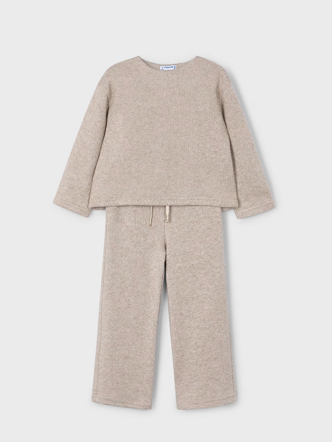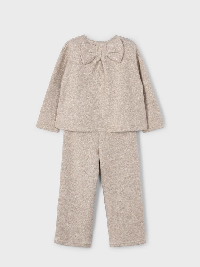 Matching sweater and pants set for girls. Soft knitted fabric. Sweater with relaxed fit, round neck, and bow detail. Pants with elastic waistband and adjustable drawstring for comfort.