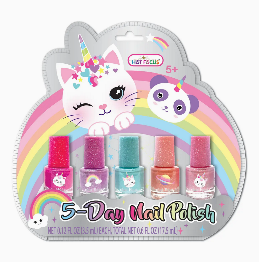 Color their week! This 5-day nail polish set adds sparkle and fun to every outfit. Kid-friendly, cute, and perfect for gifting! Need help? Call (225) 677-7776.