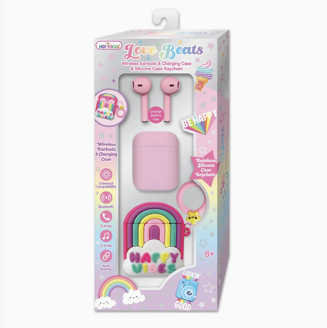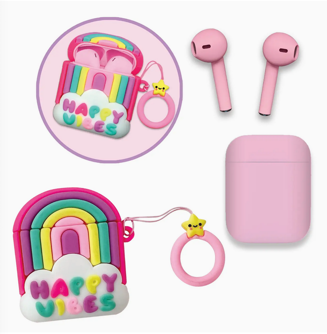 Happy vibes only! These pink wireless earbuds come with a rainbow silicone case keychain—cute, kid-friendly, and perfect for on-the-go. Need help? Call (225) 677-7776.