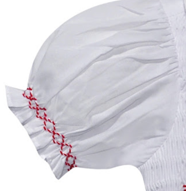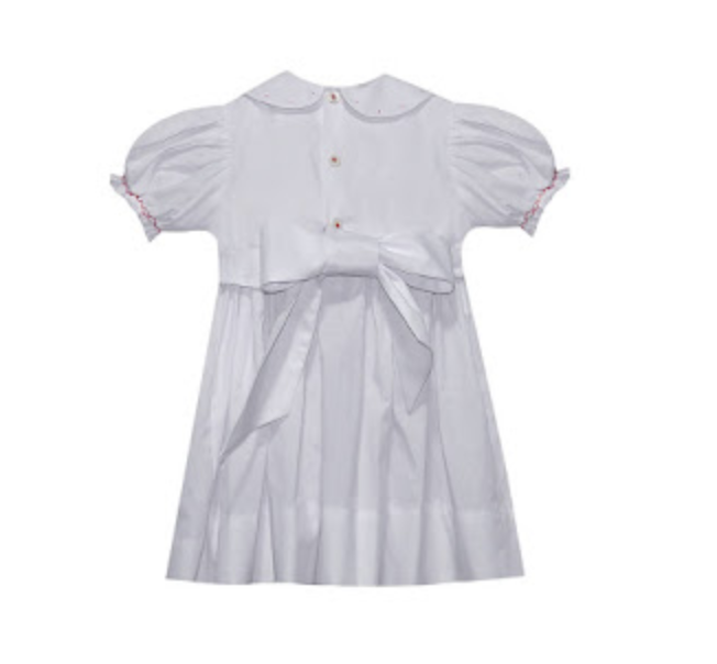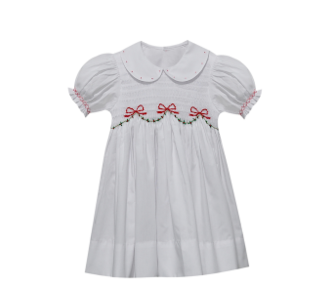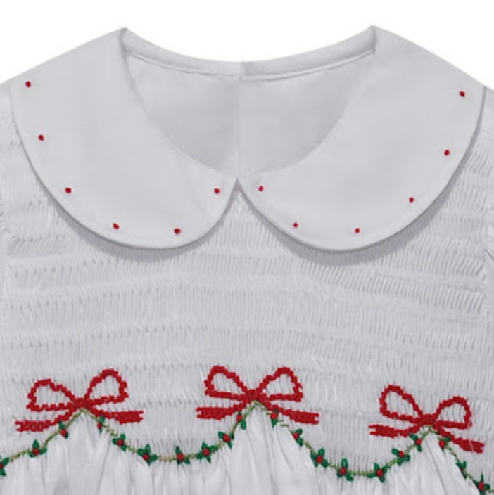 915BD The Remember Nguyen Christmas Ribbons Cate Bishop Dress features crisp white fabric with festive ribbon accents and a classic bishop collar, offering a charming, elegant look perfect for holiday celebrations, family photos, or special occasions