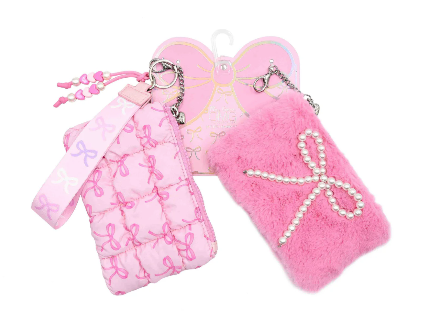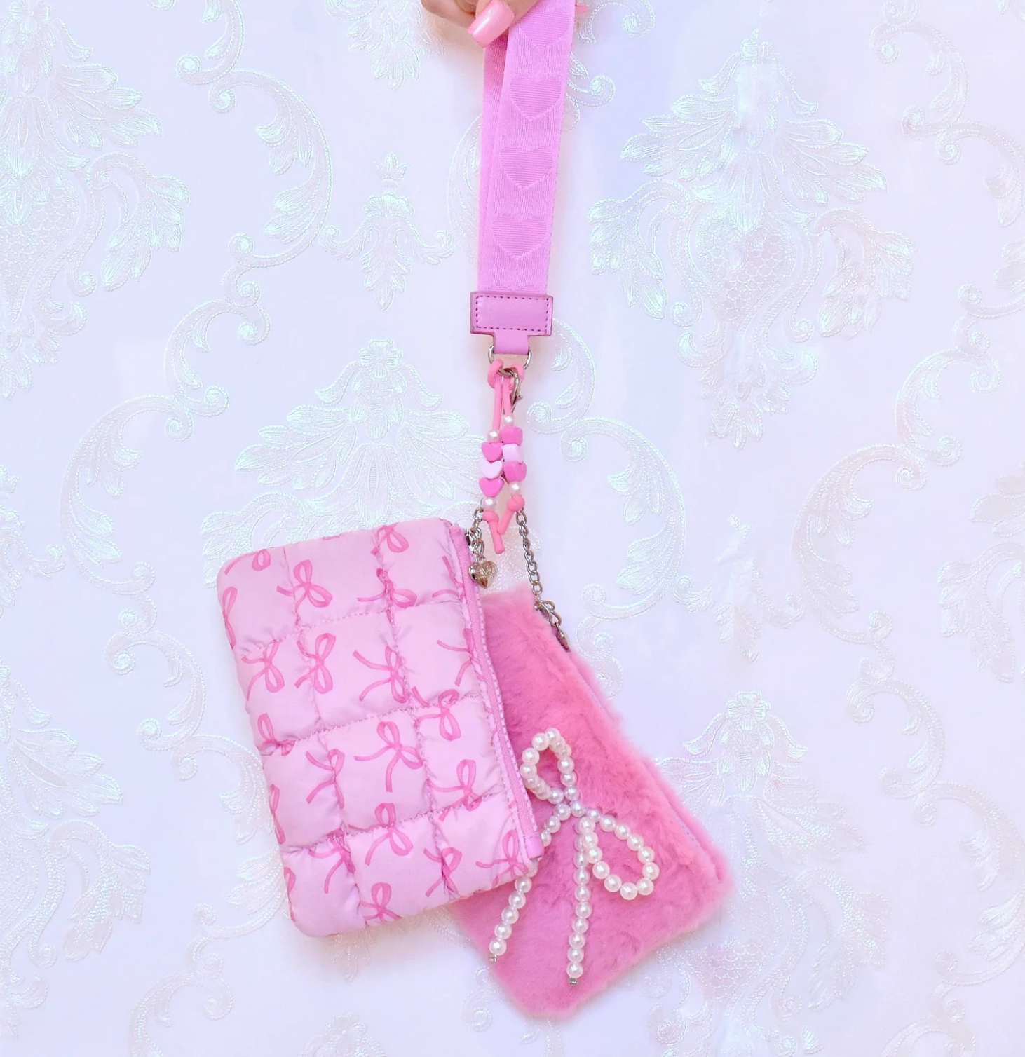 Accessorize your favorite bag with our newest 3 piece bag charm set featuring a quilted scrunchies pink bow print coin purse pouch, a pink plush coin purse pouch with a pearl bow embellishment, and a detachable bow printed wrist strap for extra funcionality - add it to a bag or wear it as a mini wristlet! Dimensions: 4.0625H X 4.625W