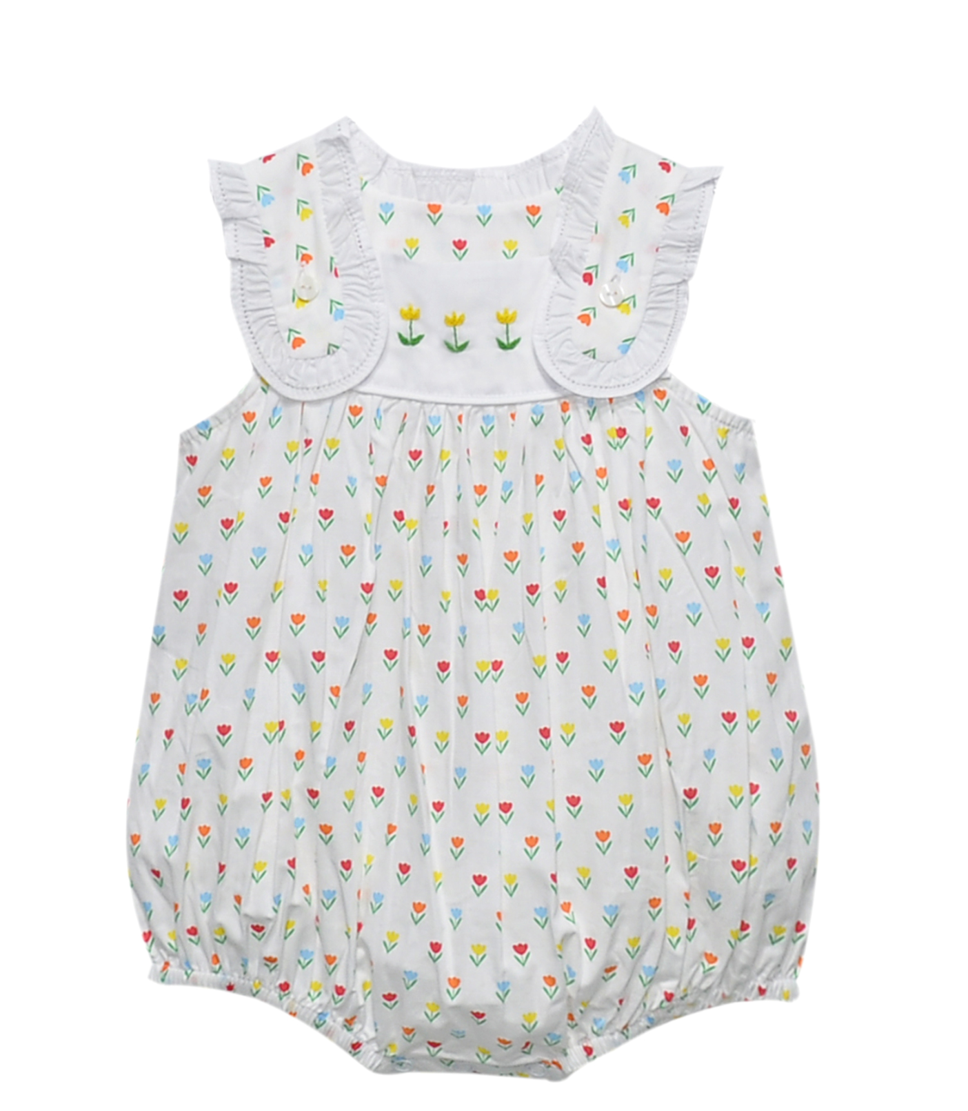 This adorable pinafore-style bubble features a colorful tulip print with delicate ruffle straps and sweet button details. Designed with a breezy silhouette and gathered leg openings, it offers comfort and charm for warm-weather...