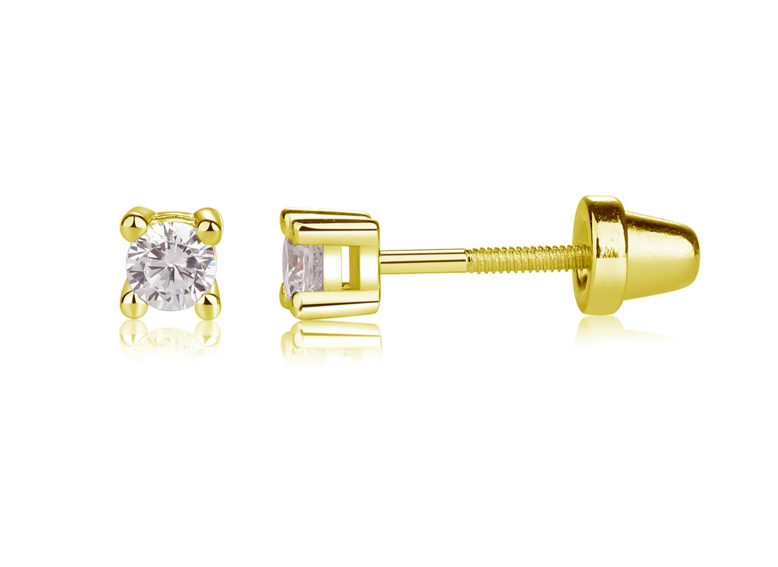 Girls 14K Gold-plated (over sterling silver) clear crystal earrings with sparkling CZ stones for children. These are perfect for newborn baby earrings, toddler jewelry, kids new pierced gold screw back earrings.