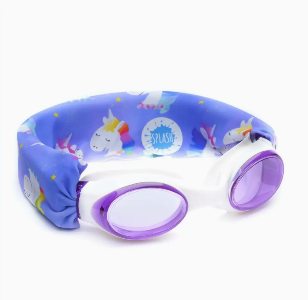 Our rainbow unicorn swim goggle features our tangle-free, patent-pending strap in a colorful unicorn print, paired with a white frame and lightly tinted purple lenses.