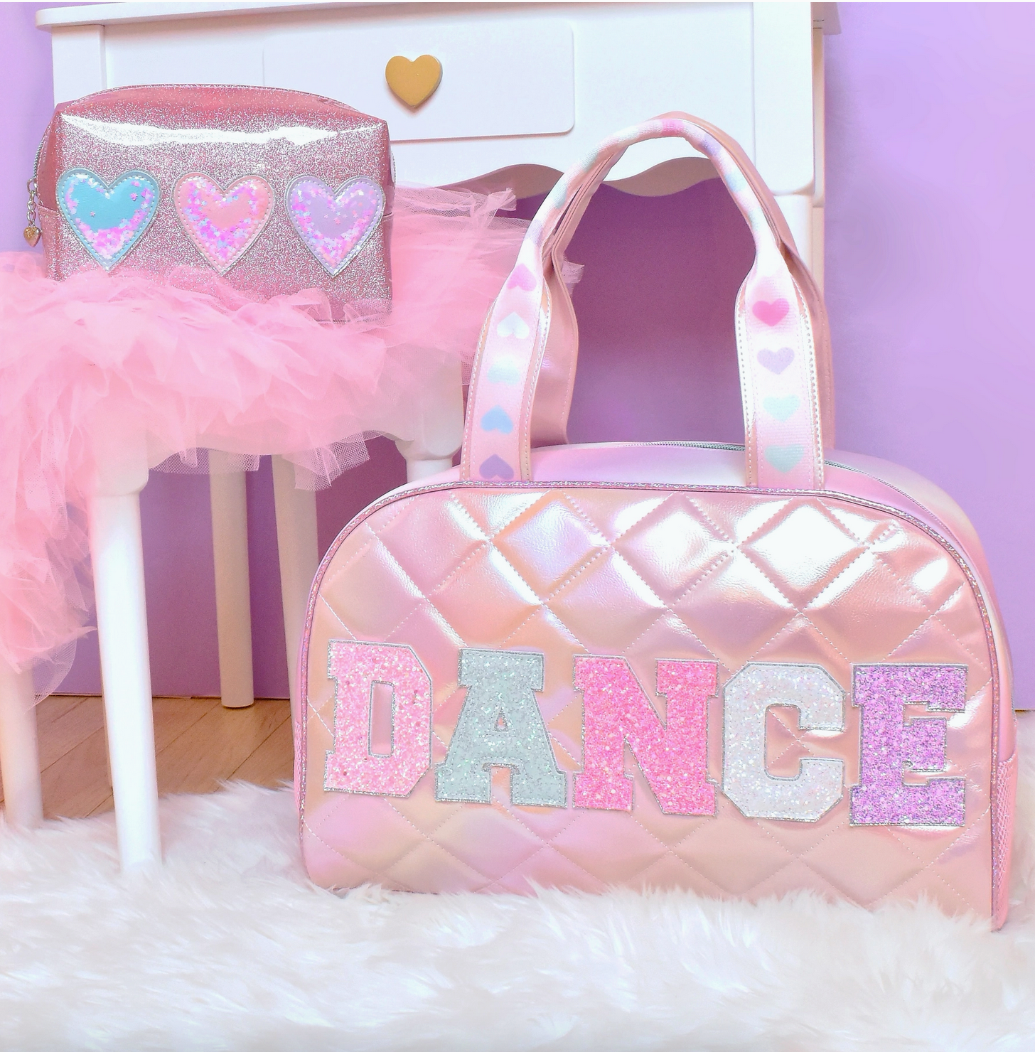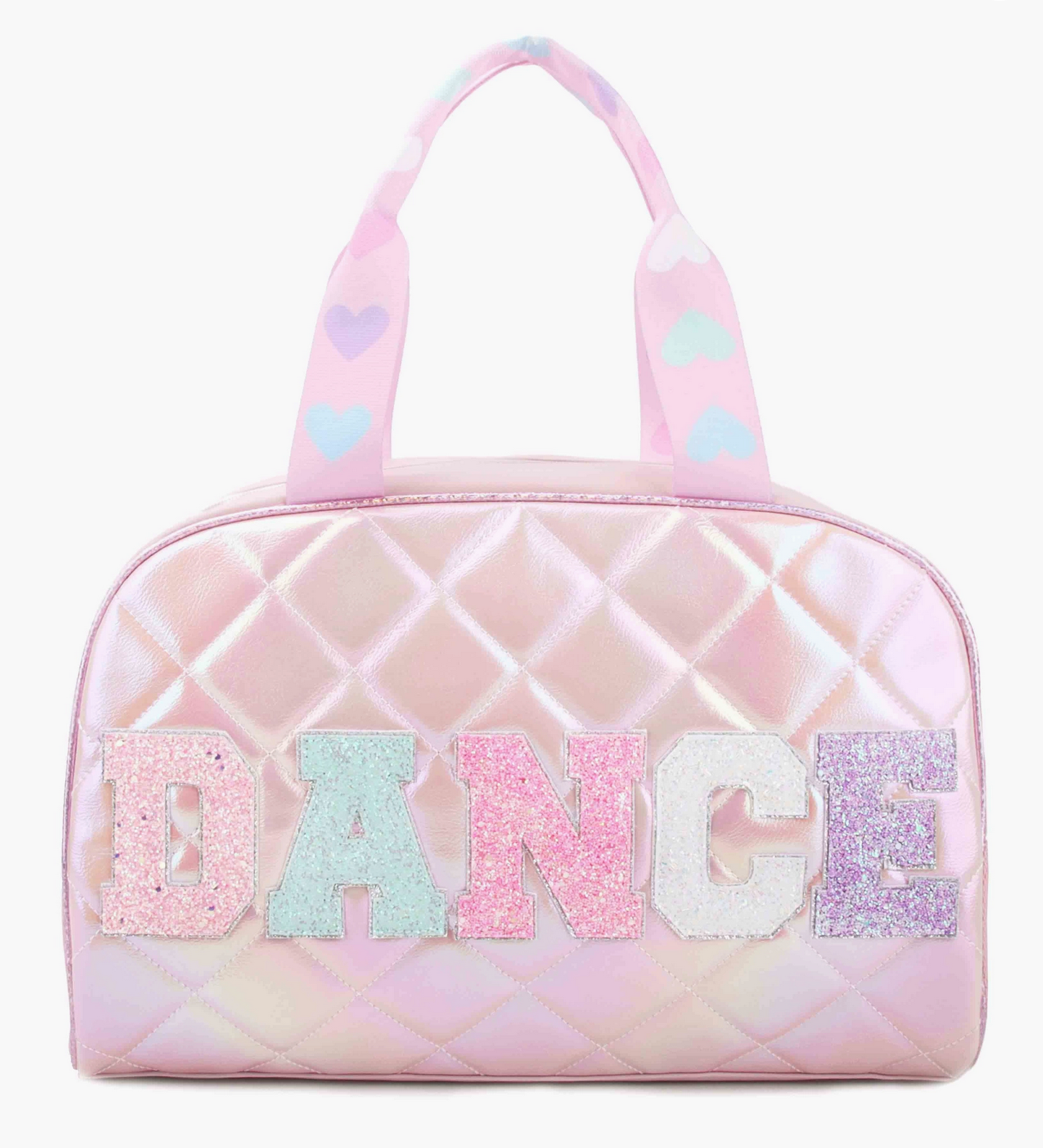 Your mini will steal the spotlight with this medium sized duffle bag! Detailed with glitter 'DANCE' varsity letter applique patches, and pastel heart-printed straps - it's the perfect bag to carry all of your dancer's recital essentials!