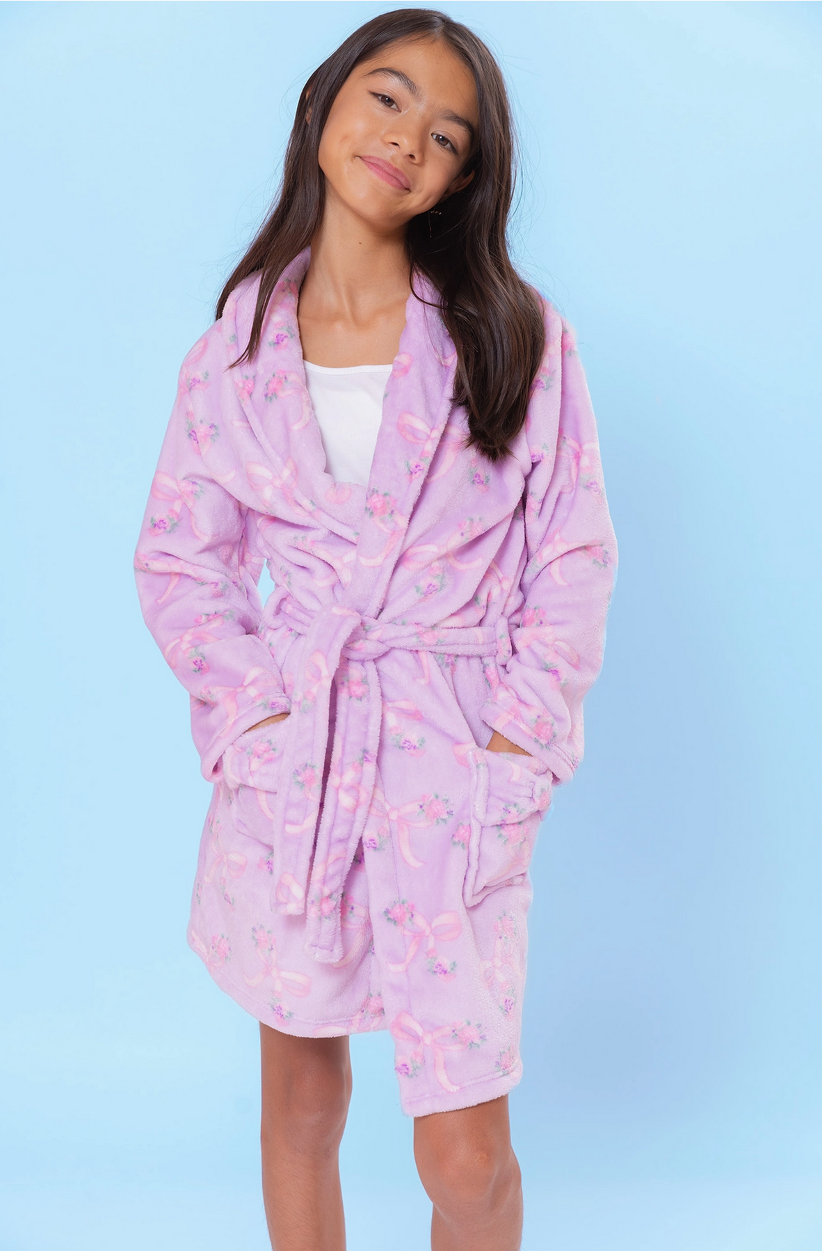 So plush and snuggly, they'll want to wear our new plush robe all day long! Detailed with a shawl collar, waist tie, and two plush bow front pockets - they'll be spa-ready at any moment!