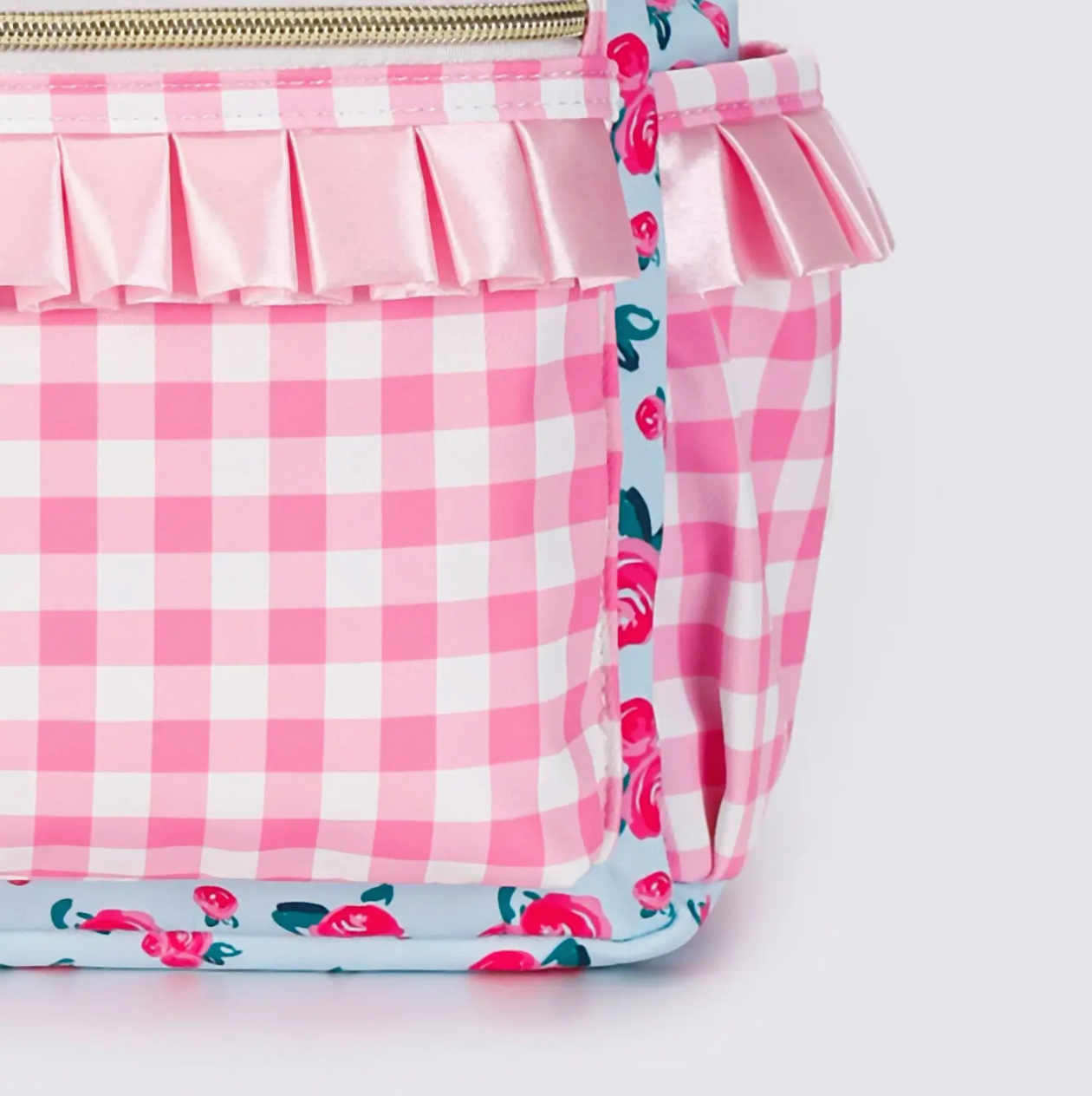Too cute to miss. Floral + gingham + ruffles = the perfect backpack for your little fashionista!