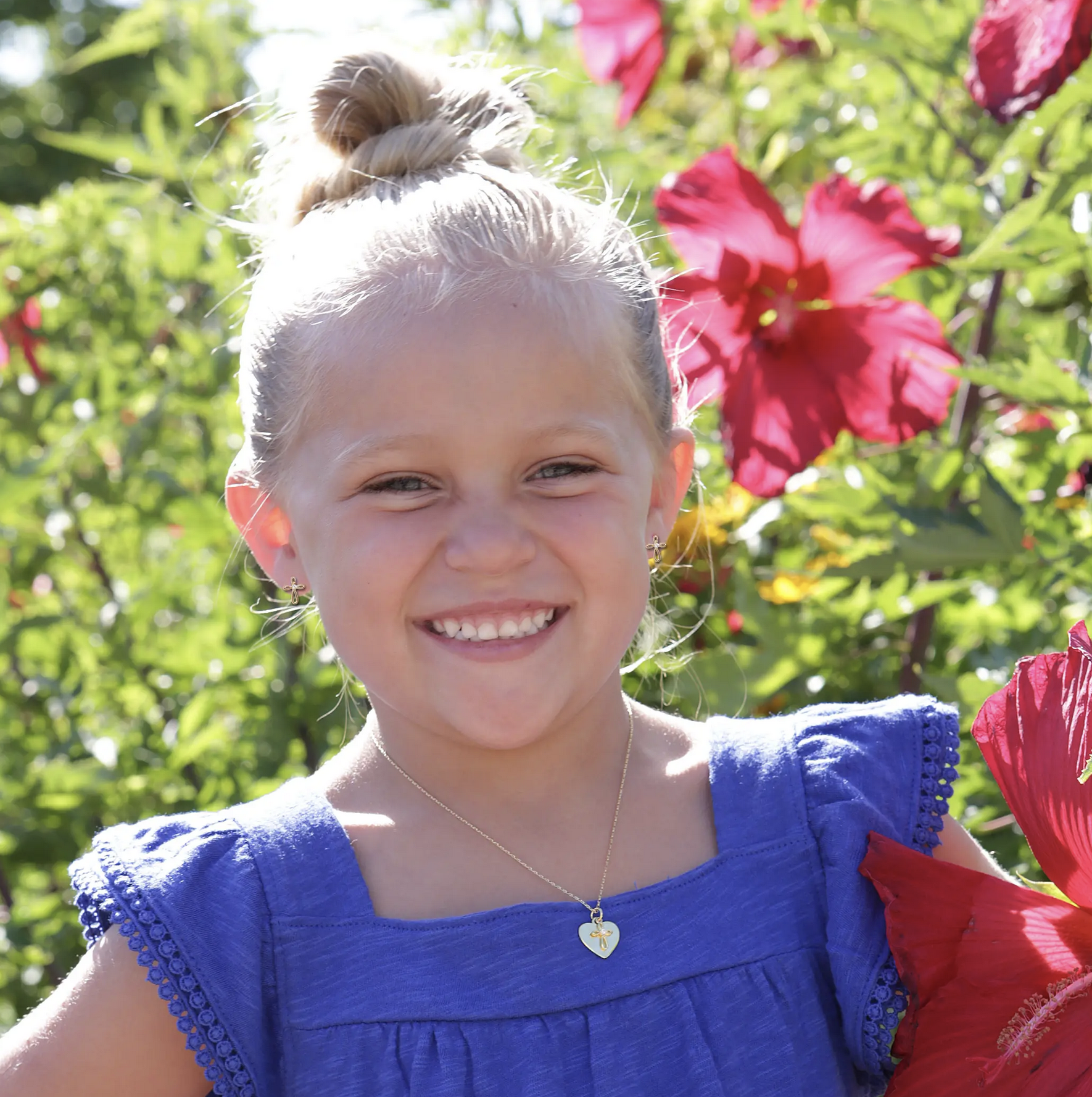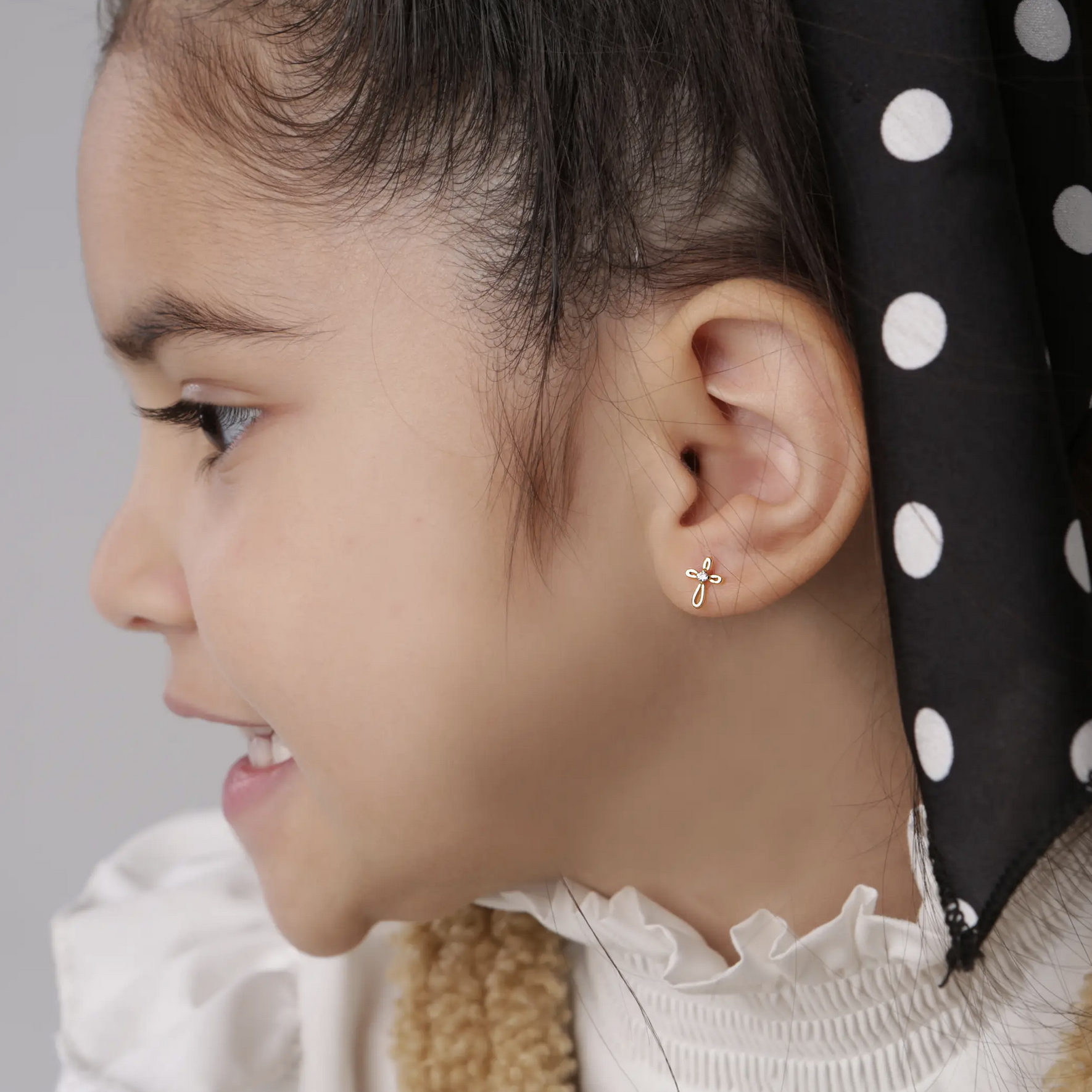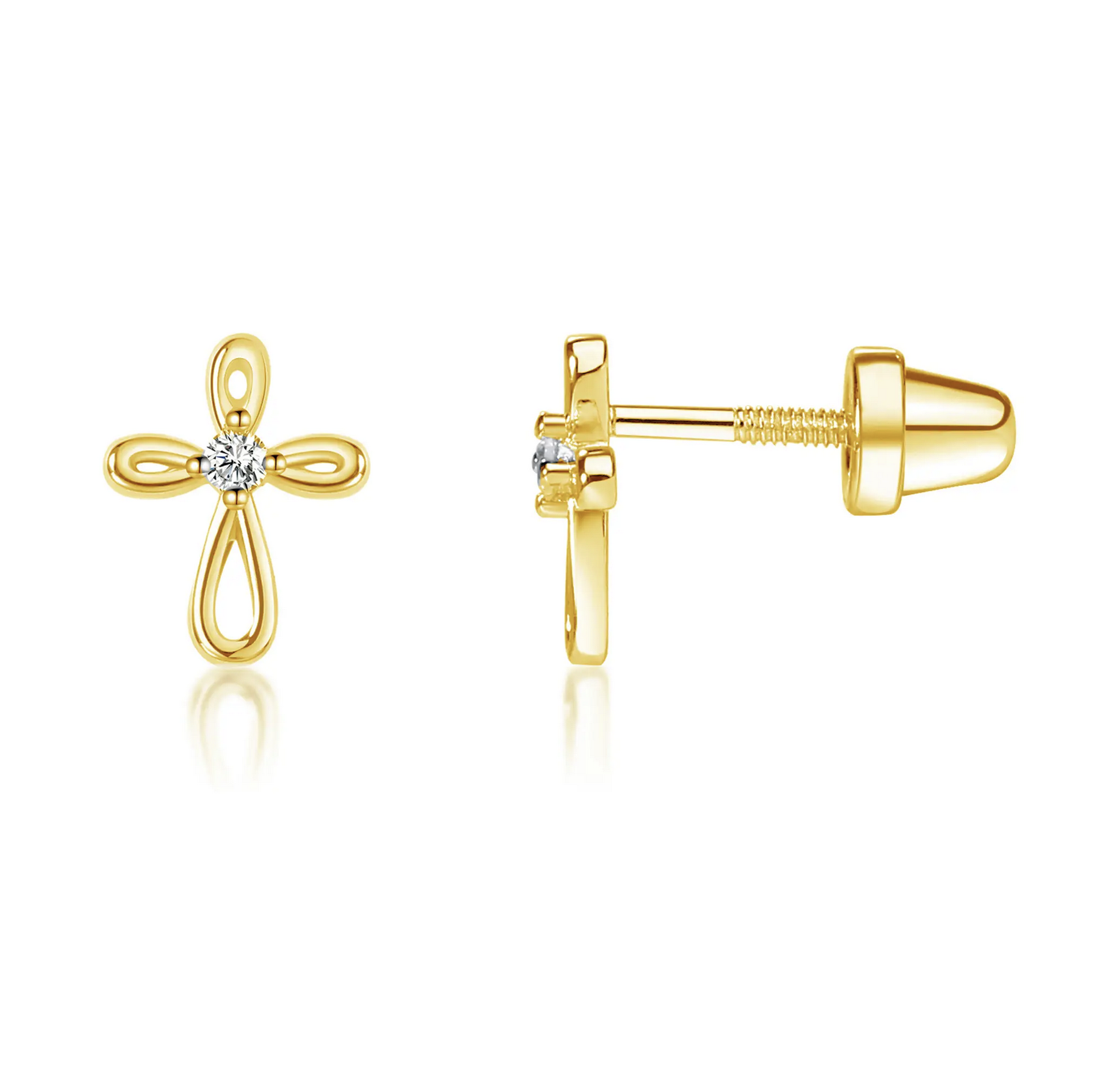 Children's 14K gold-plated (over sterling silver) infinity cross earrings for little girls. These dainty earrings have screw backs that are so nice for children so they stay put and she won't lose them.