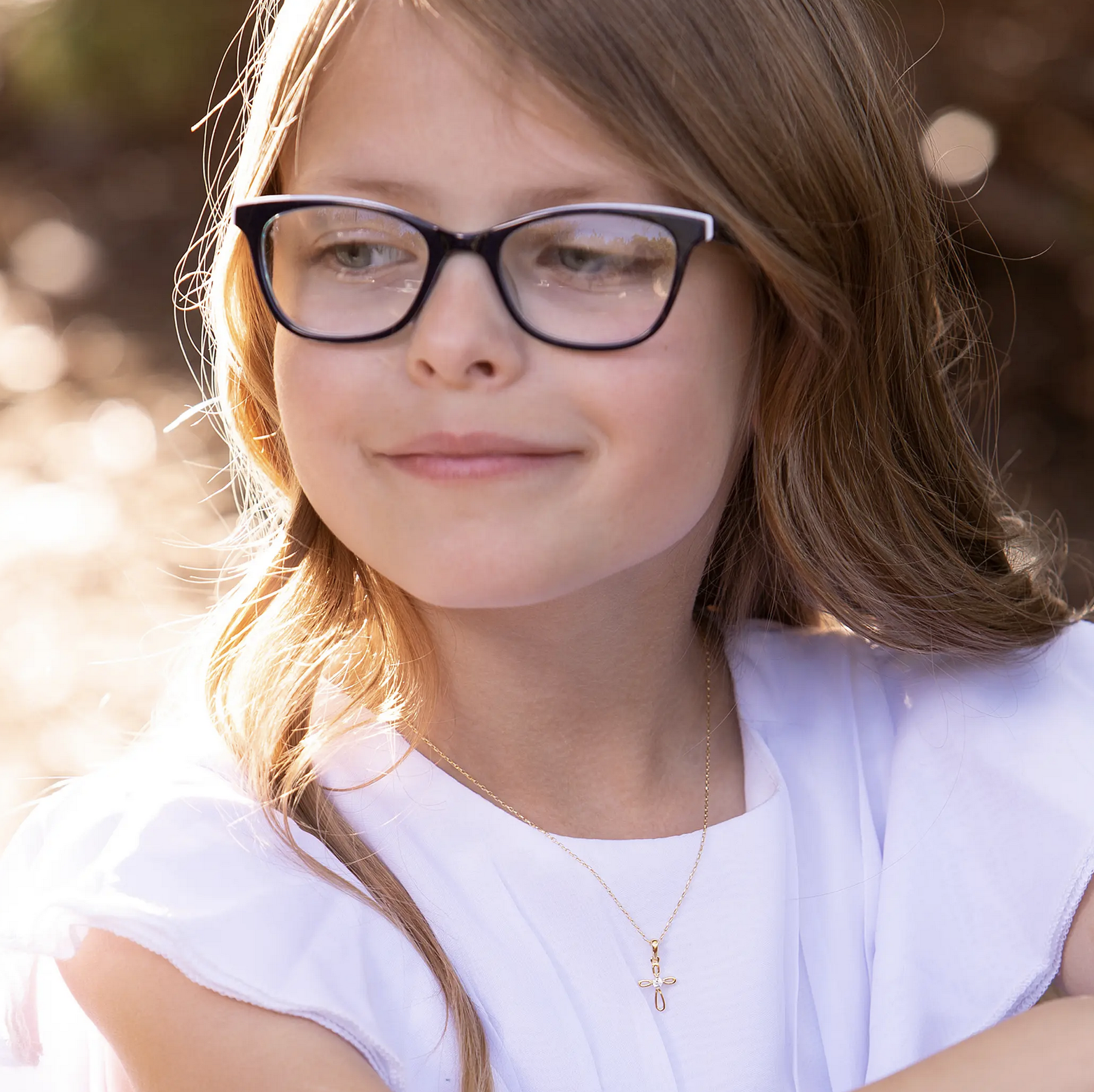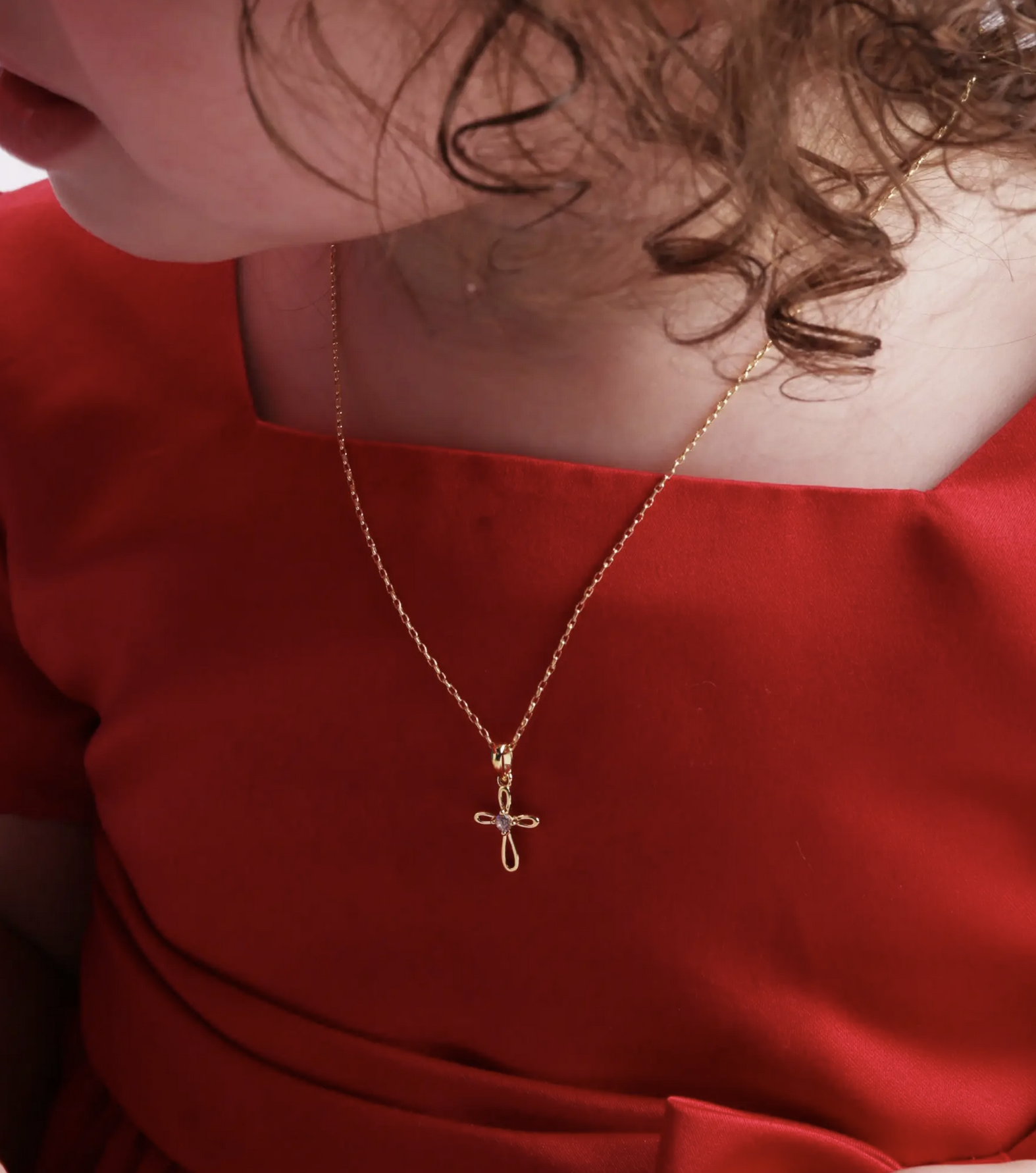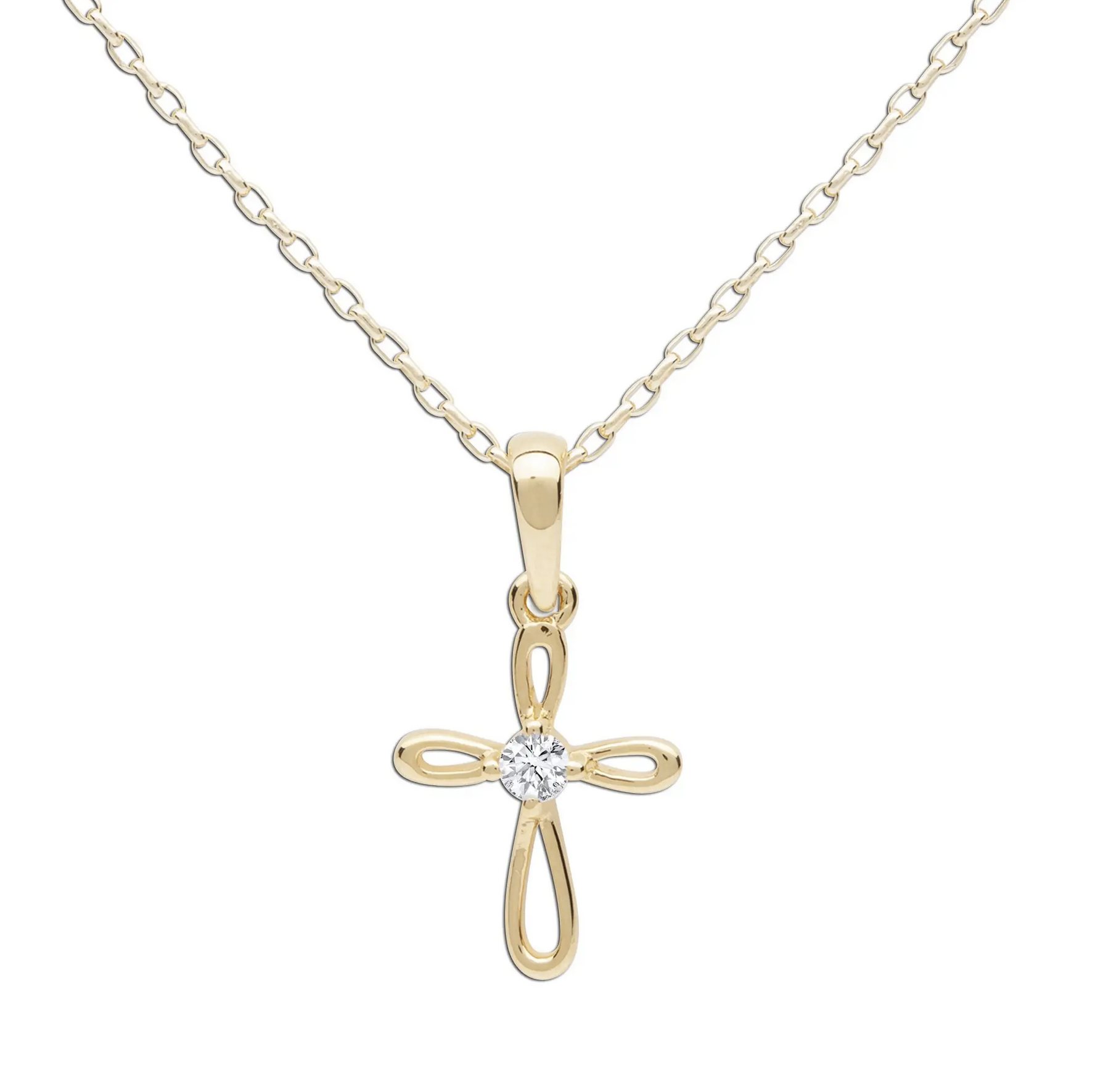 GPBCN-Cross (Infinity) br>Dainty 14K Gold-plated charm necklace accented with a precious infinity cross charm with sparkling CZ. Perfect gift for those special occasions such as first communion gift for girls! Coordinating bracelet and earrings available.