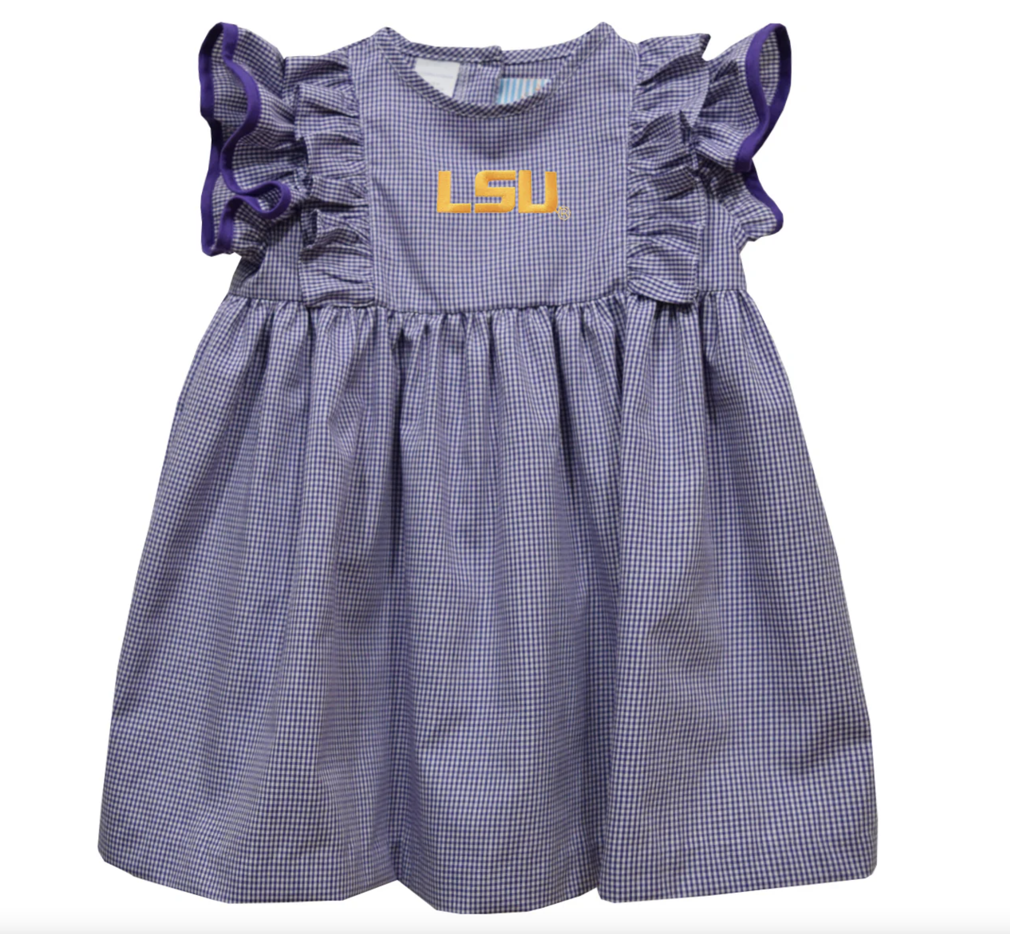 Let your girl look modern and stylish in her new LSU Tigers Embroidered Purple Gingham Girls Ruffle Dress. Let her play, go to the game, and cheer loudly and proudly with her LSU Tigers Embroidered Purple Gingham Girls Ruffle Dress.