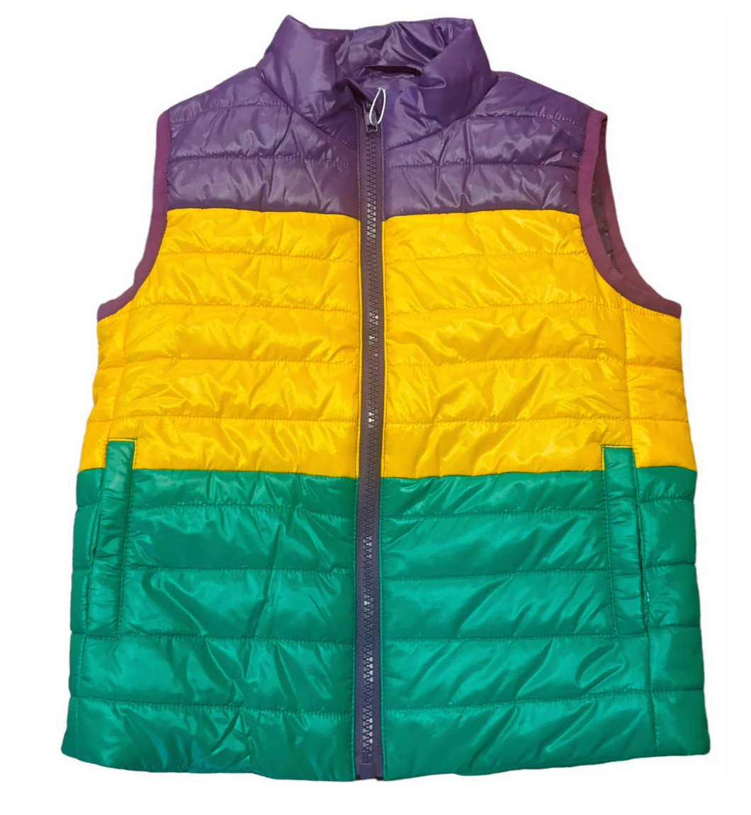 Mardi Gras Quilted Vest Stay warm in Mardi Gras style! This colorblock puffer vest features purple, gold, and green panels with a lightweight feel—perfect for layering on cool days. Need help with your purchase? Call (225) 677-7776 for assistance.