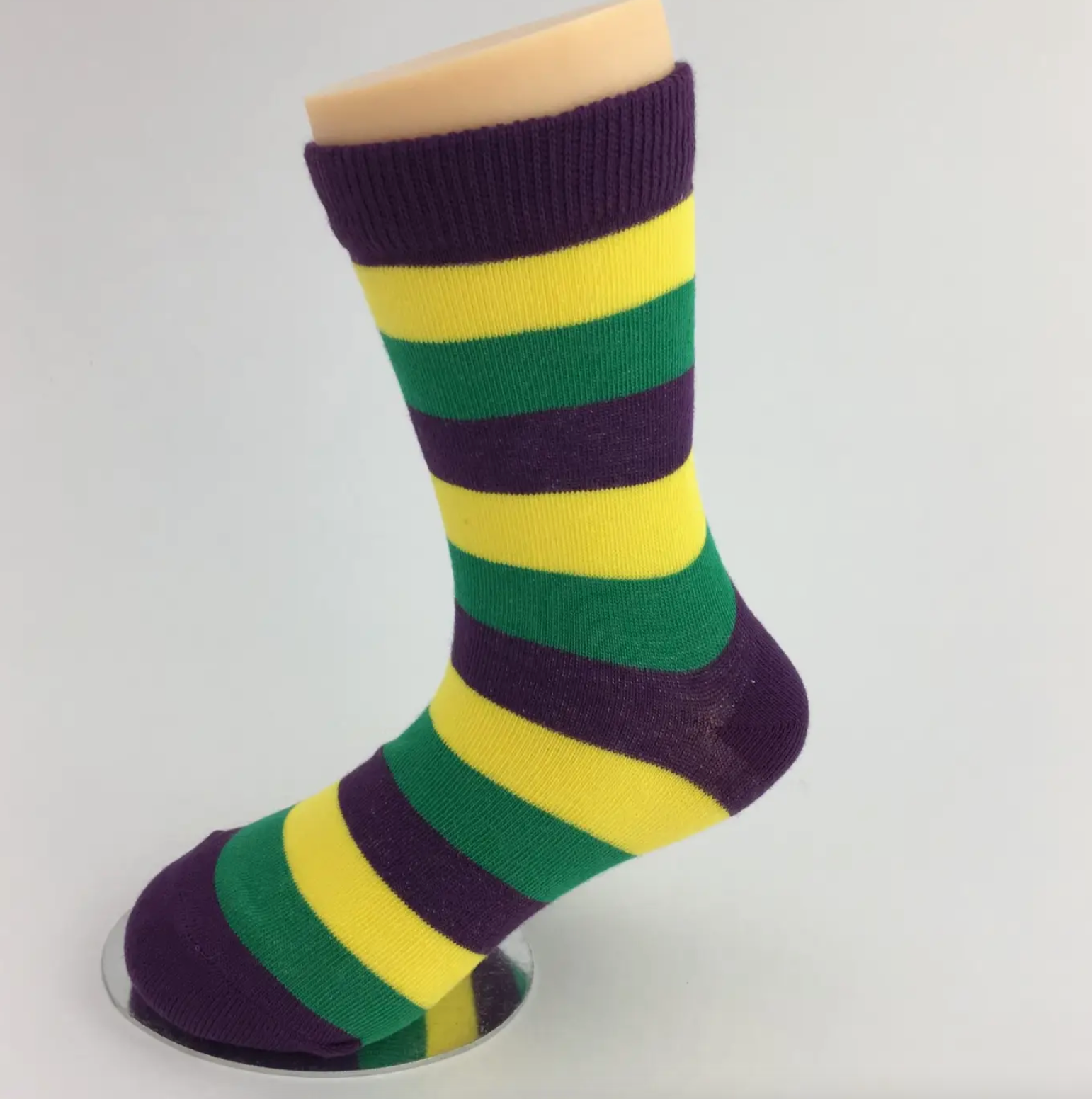Mardi Gras Stripe Socks Festive Mardi Gras knee-high socks featuring bold purple, green, and gold stripes. A fun finishing touch for parades, school days, and seasonal outfits. Need assistance with your purchase? Call (225) 677-7776.