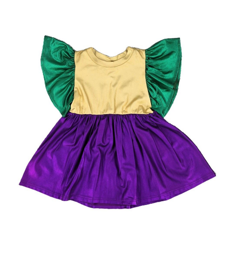 MD002 This metallic Mardi Gras dress is pure parade-ready perfection—bold colors, shimmery shine, and made for little ones who love to stand out. Perfect for parades, parties, and all the Mardi Gras magic!