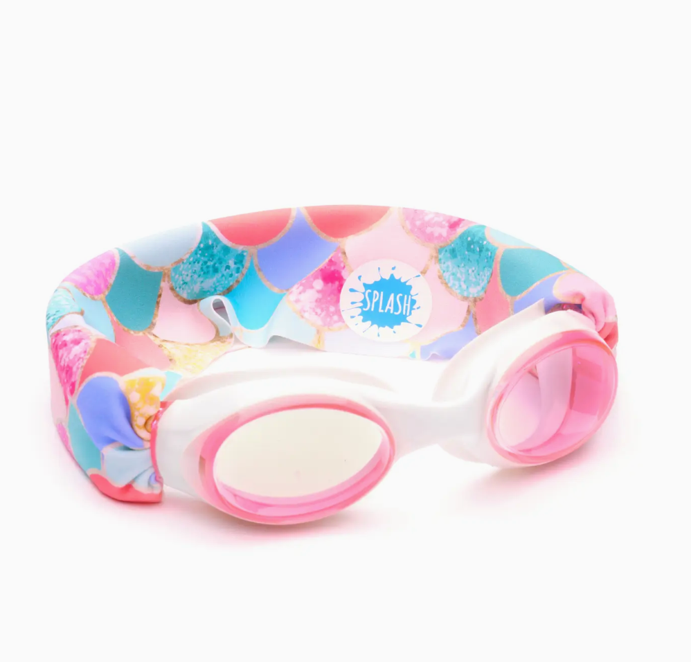 Our mermaid swim goggle features our tangle-free strap in a pink, teal, coral and gold mermaid scale print, paired with a white frame and lightly tinted pink lenses.