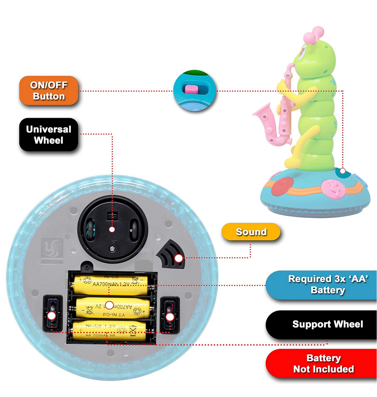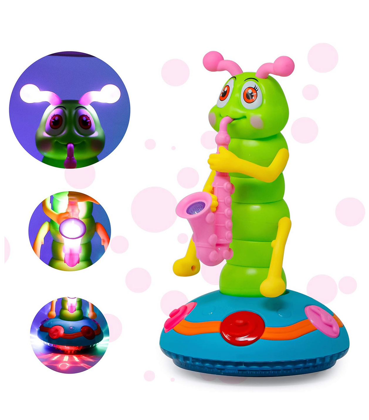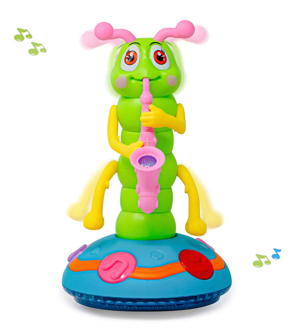 This adorable worm lights up, plays music, flaps its wings, and dances with real moves! Great for encouraging rhythm, movement & smiles. Easy on/off switch. A sensory favorite for babies!