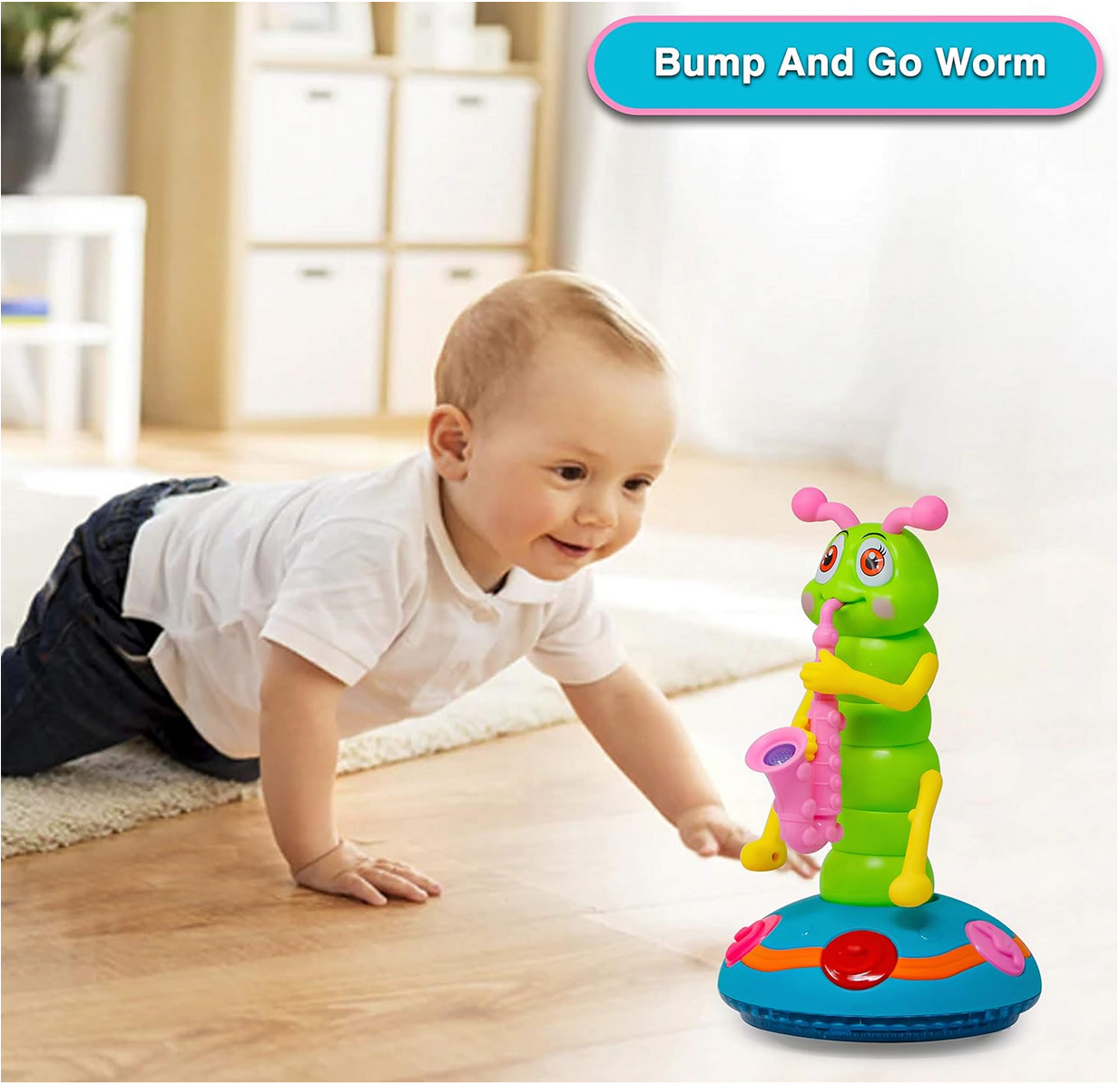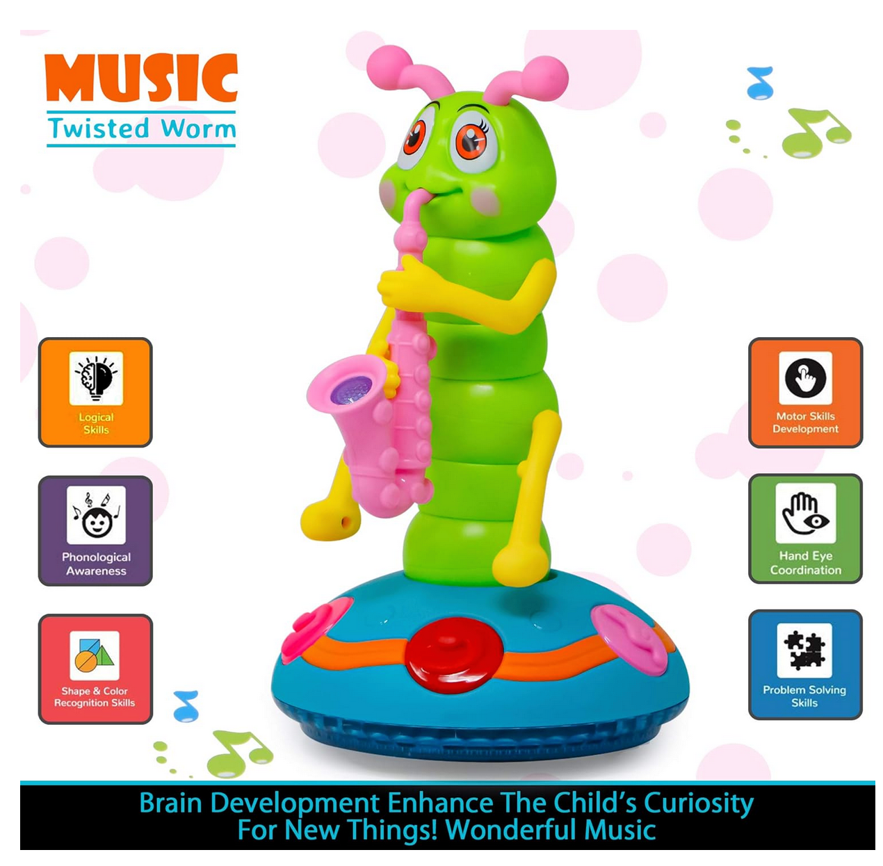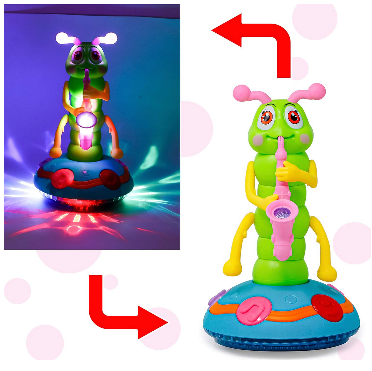 This adorable worm lights up, plays music, flaps its wings, and dances with real moves! Great for encouraging rhythm, movement & smiles. Easy on/off switch. A sensory favorite for babies!