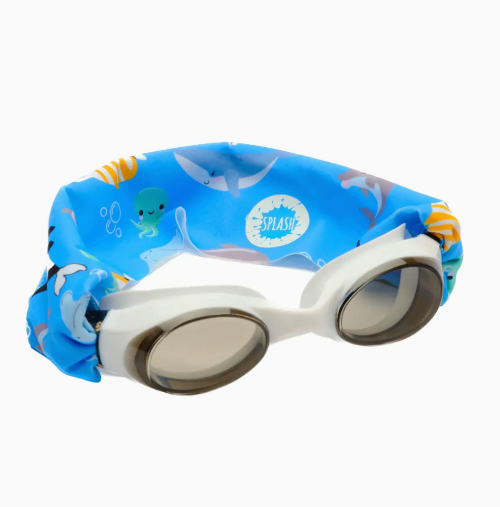 Our Ocean Friends swim goggle features our tangle-free strap in a friendly sea animal print paired with white frames and lightly tinted grey lenses.