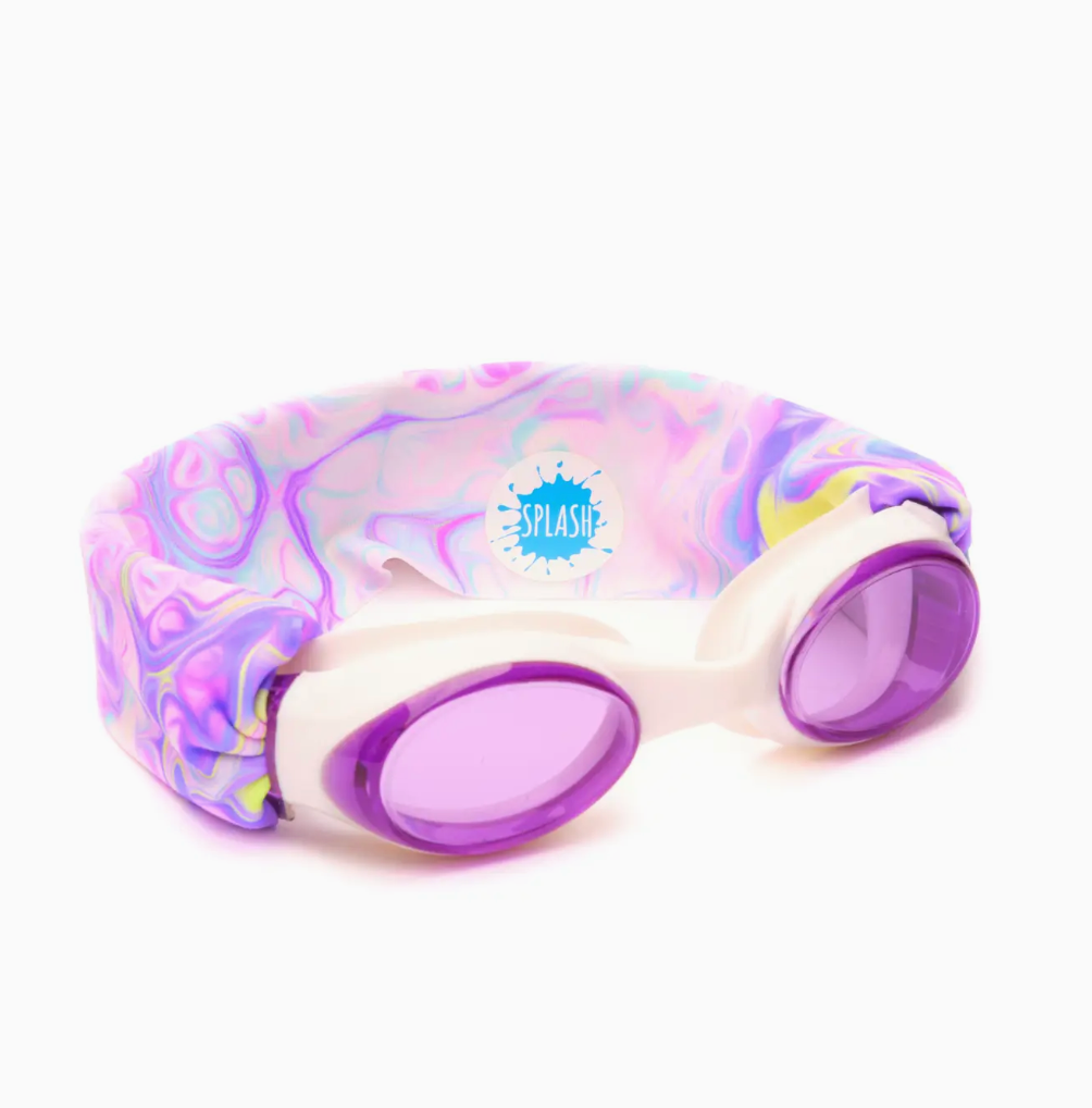 Our Pastel Swirl swim goggle features our tangle-free strap in a colorful swirled paint print, paired with a white frame and lightly tinted purple lenses.