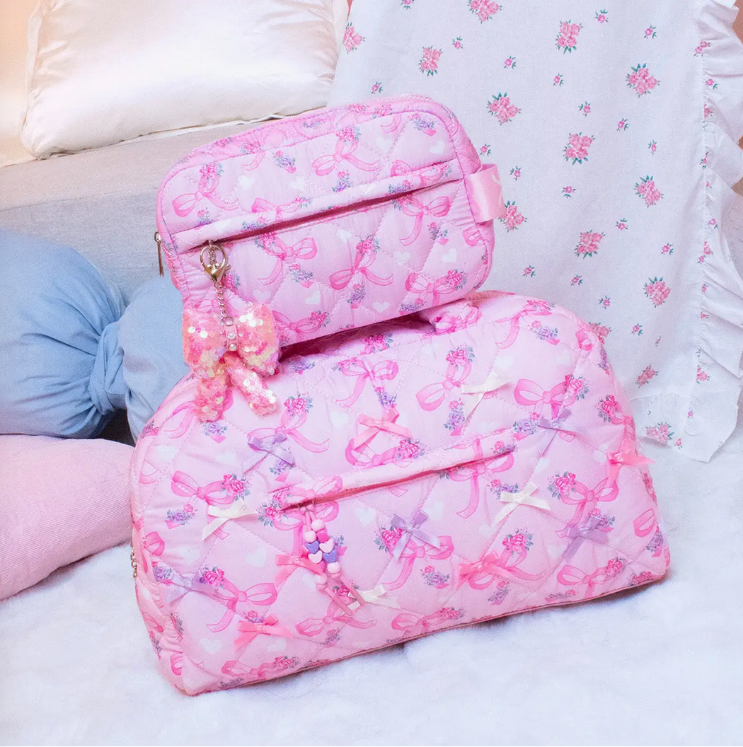 This pink quilted pouch is perfect for travel, dance, or daily essentials! Features an allover bow print, front zip pocket, and a sparkly sequin bow charm. Lightweight, soft, and oh-so-sweet!