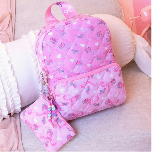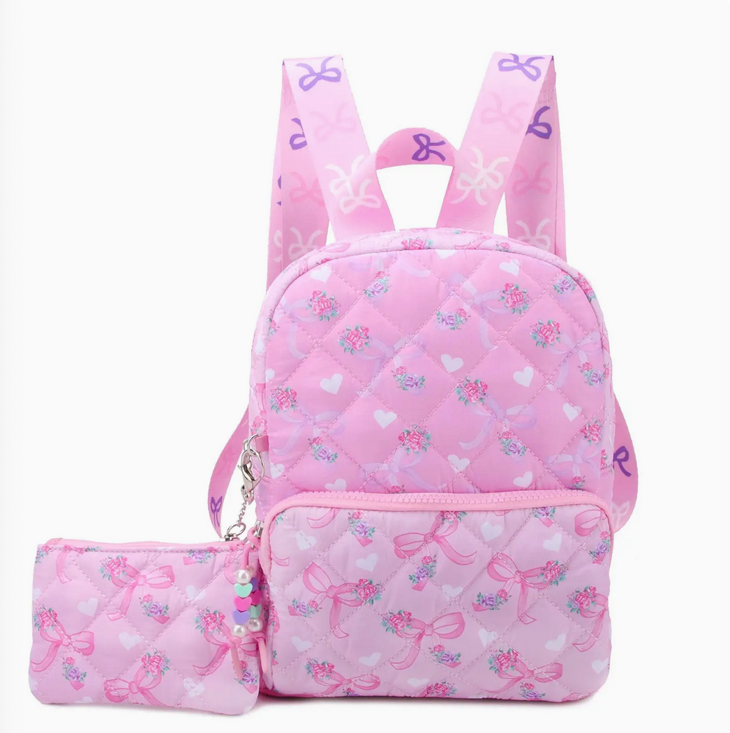 Perfectly pink and play-ready! This quilted backpack features heart & bow print, a roomy main pocket, matching mini pouch, and a colorful charm. Ideal for school, travel, or gifting—soft, sweet, and stylish!
