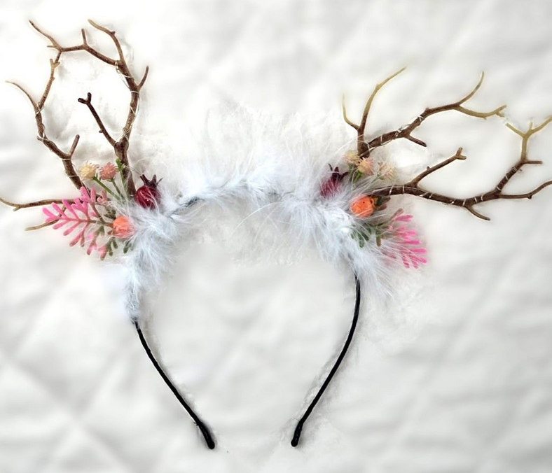 HB025 ,br>A soft winter wonderland headband with fluffy fur, delicate florals & whimsical antlers. Perfect for photos, holiday outfits & dress-up magic. Need help? Call (225)677-7776.