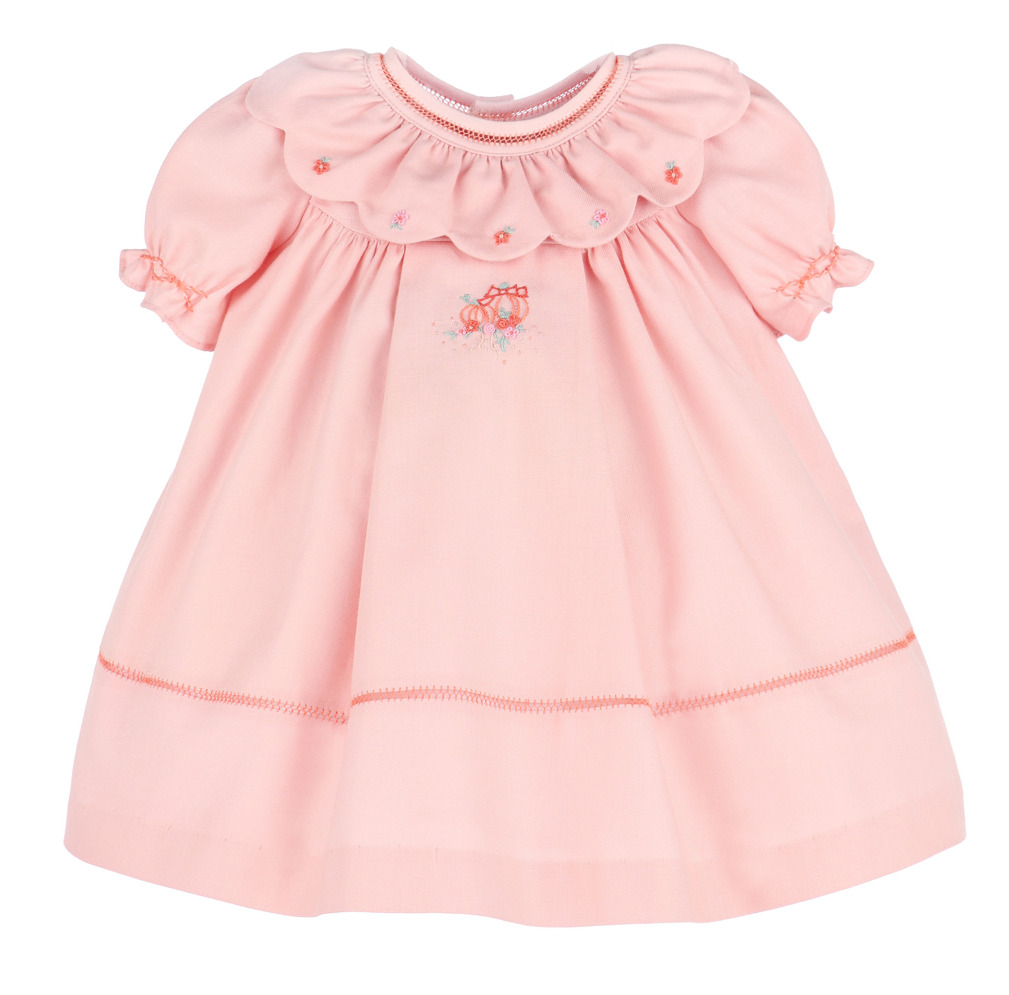 Sweet and timeless, this Luli & Me dress features delicate pumpkin and floral embroidery on the chest, a scalloped yoke collar, and puff sleeves with ribbon ties. Its full gathered skirt and A-line silhouette make it perfect for fall occasions.