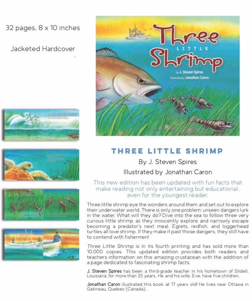 Dive into the sea to follow three very curious little shrimp as they innocently explore and narrowly escape becoming a predator’s next meal. Egrets, redfish, and loggerhead turtles all love shrimp. If they make it past those dangers, they still have to contend with fishermen!Three Little Shrimp is in its fourth printing and has sold more than 10,000 copies. This updated edition provides both readers and teachers information on this amazing crustacean with the addition of a page dedicated to fascinating shrimp facts.